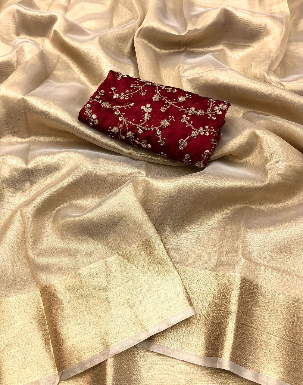 Saree description - Celebrity inspired gold colour tissue silk saree with gold weaving border comes with beautiful shining & contrast maroon colour tussles on pallu