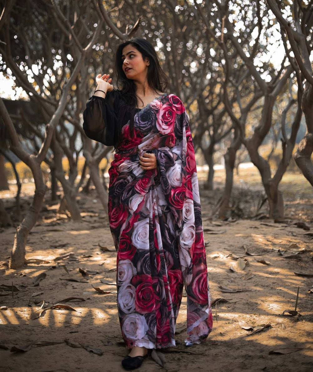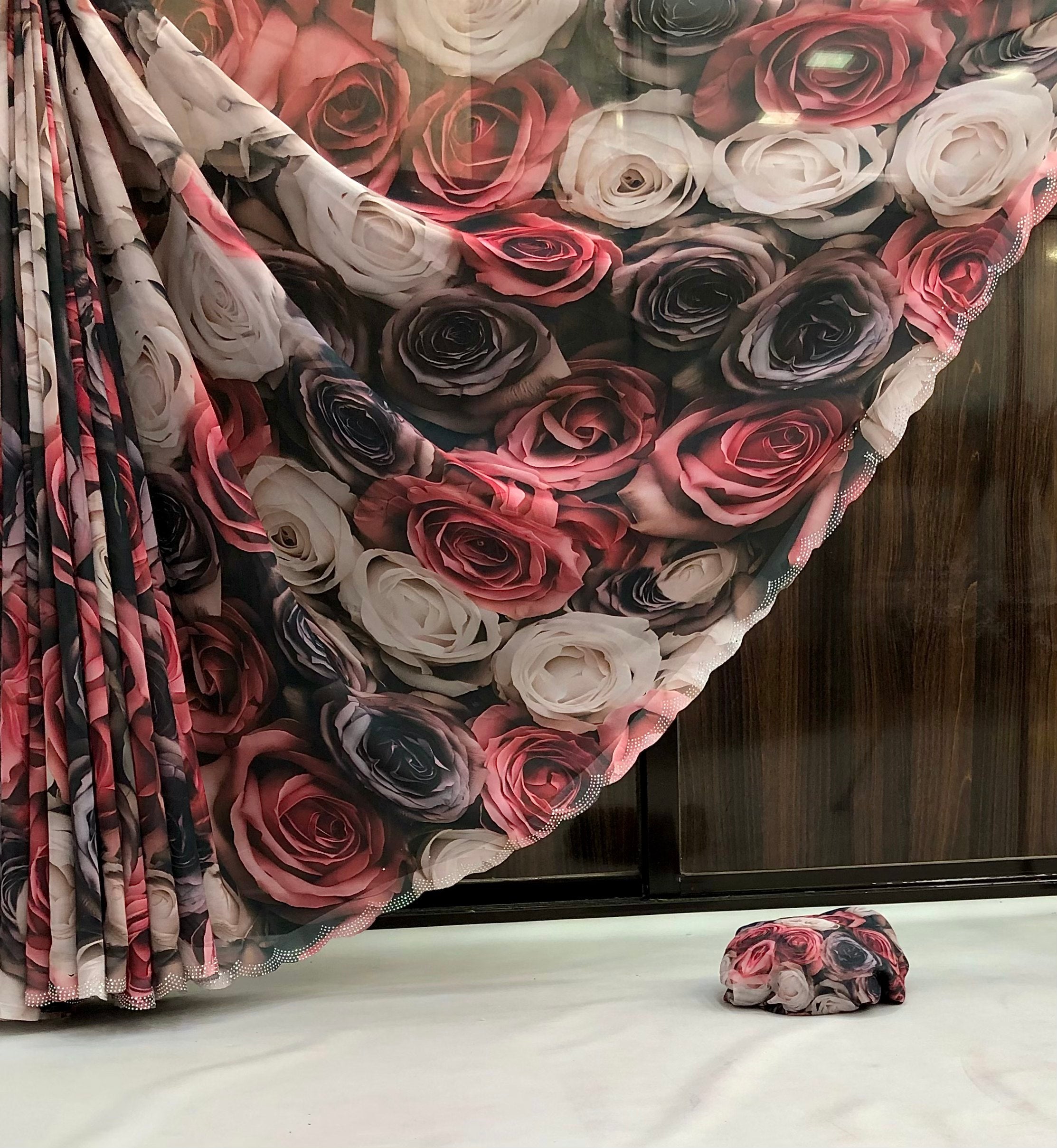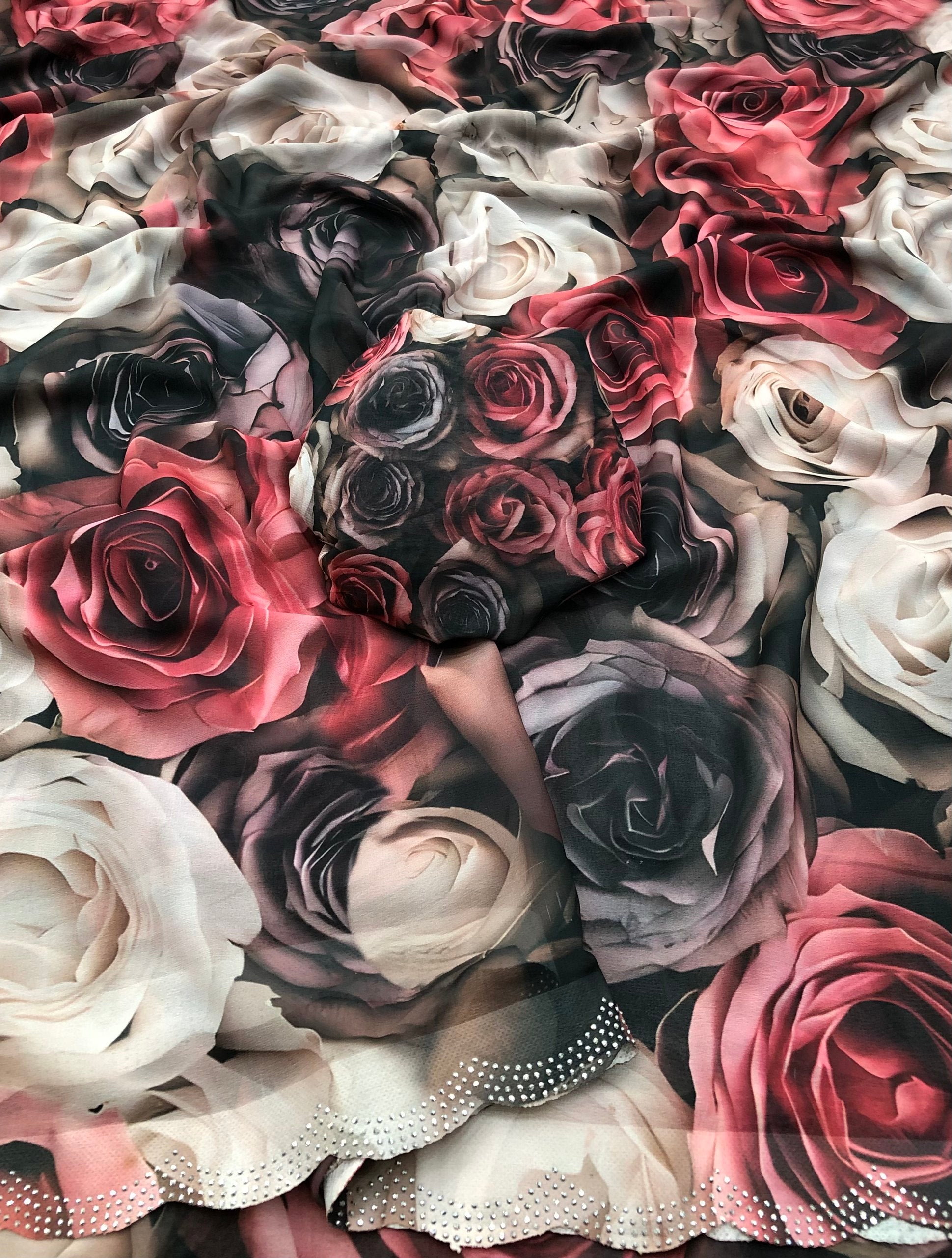 Fabric - Soft & smooth weightless chiffon Rose floral digital print with siroski work scalloped cutwork border