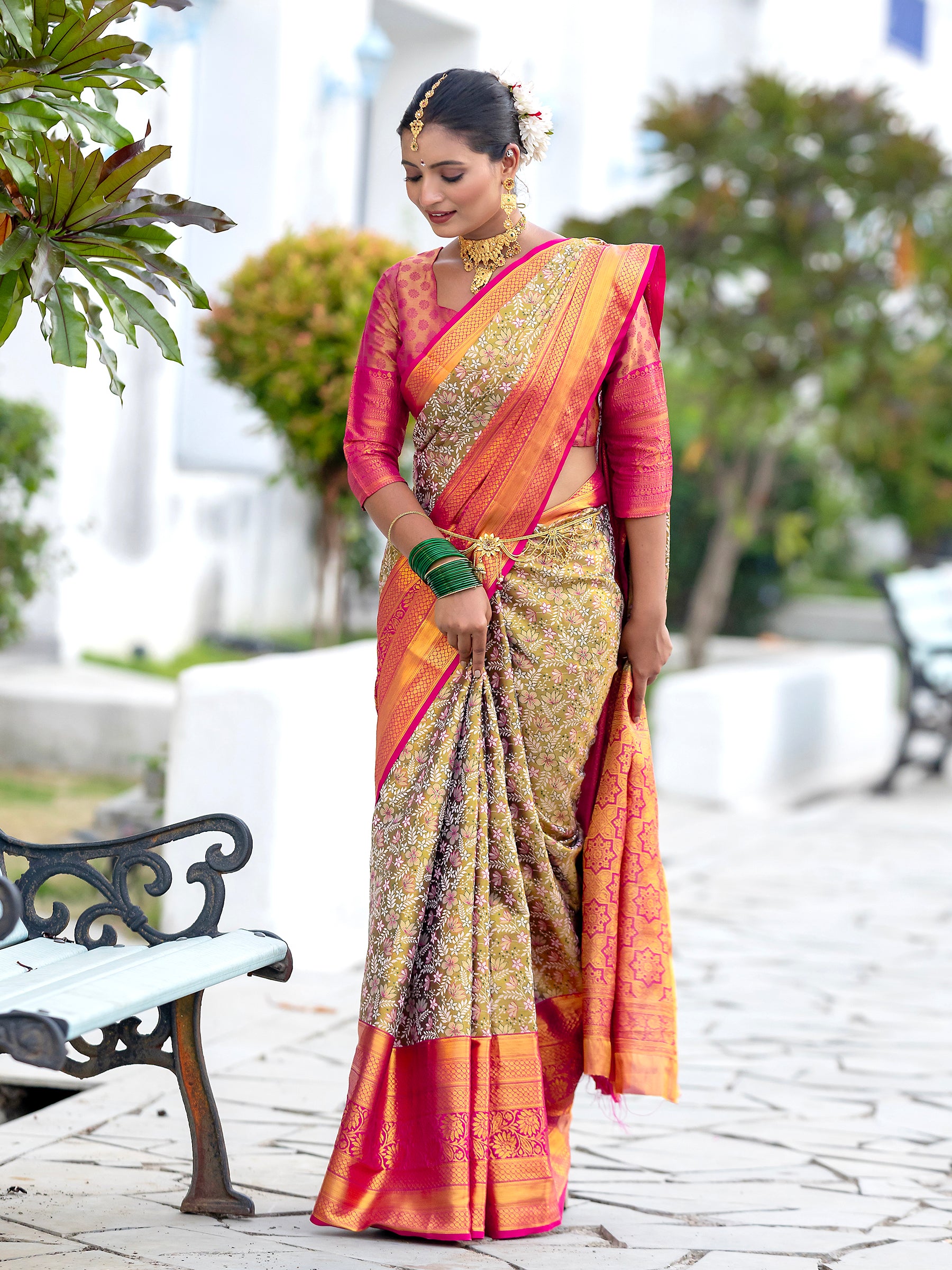 Saree description - Kanjivaram silk gold zari weaving with floral & leaf design with mina weave comes with contrast pink colour 8inch floral design weaving border & pink colour rich weaving pallu.