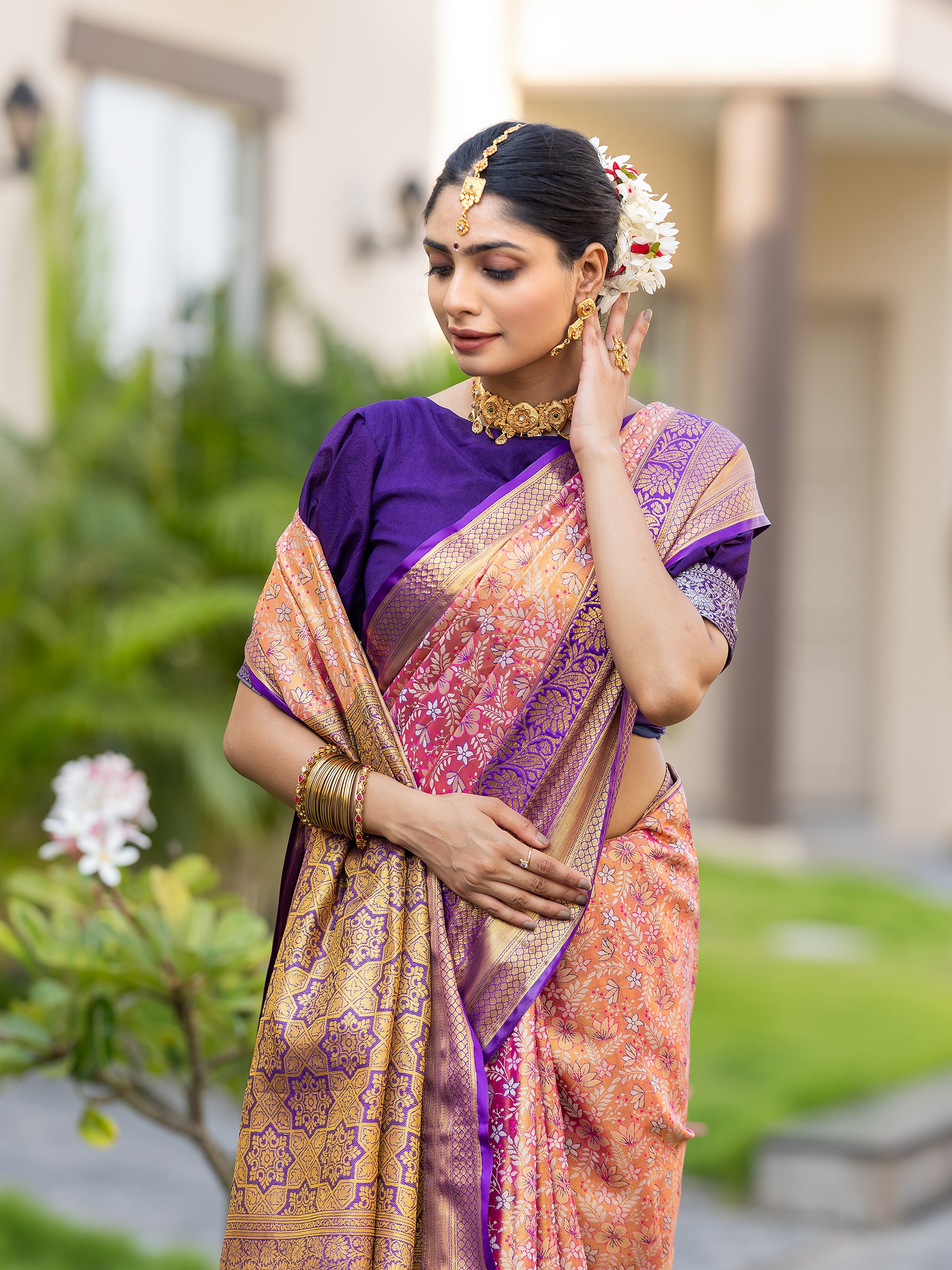 Saree description - Kanjivaram semi pattu silk gold zari weaving pink colour with floral design & mina weave, comes with 10 inch floral design purple colour weaving border & rich weaving pallu.
