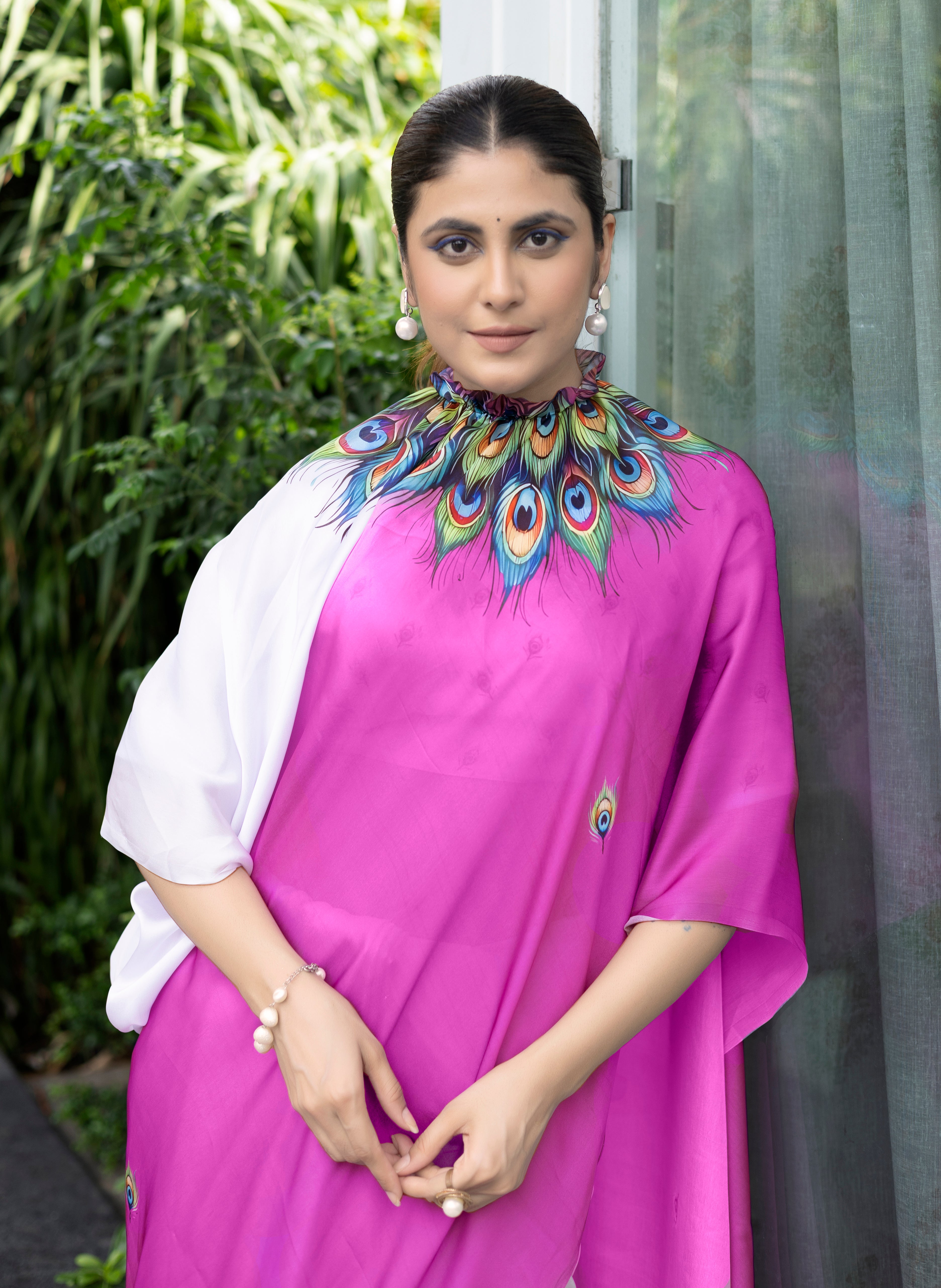 Saree description - Soft & smooth satin Georgette with beautiful peacock feather digital print comes with a stay able free-hand design with Pink & White colour combination
