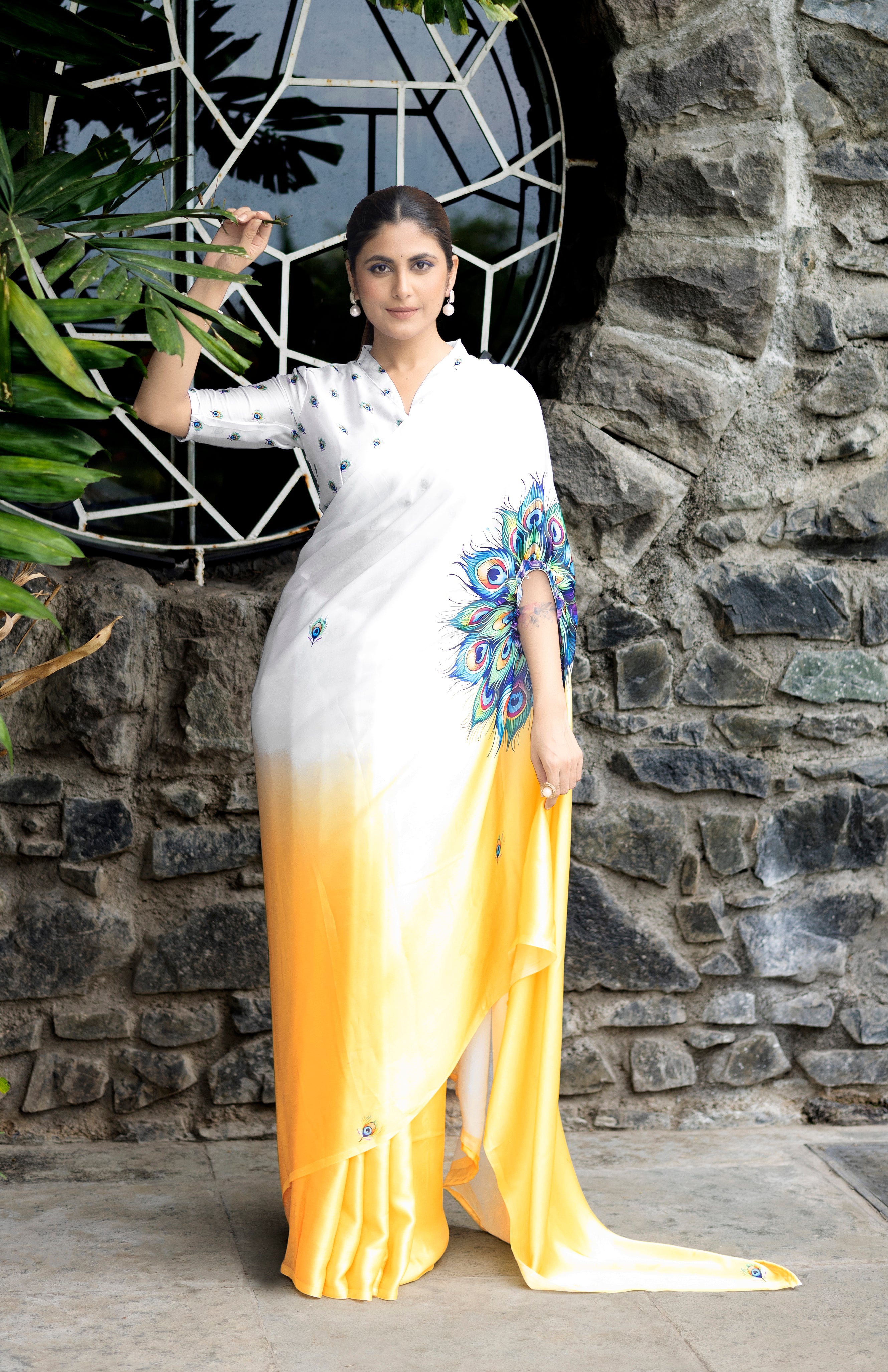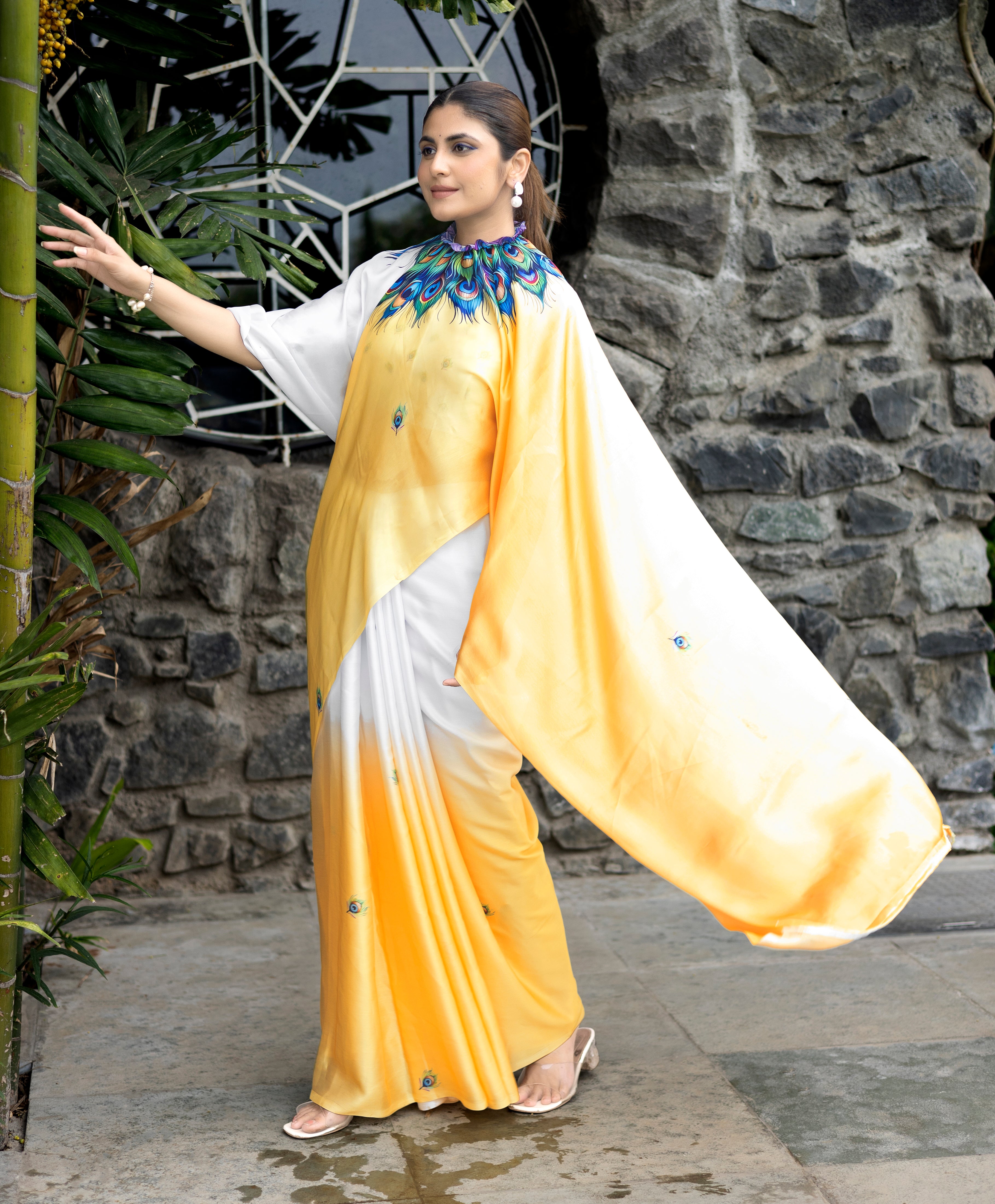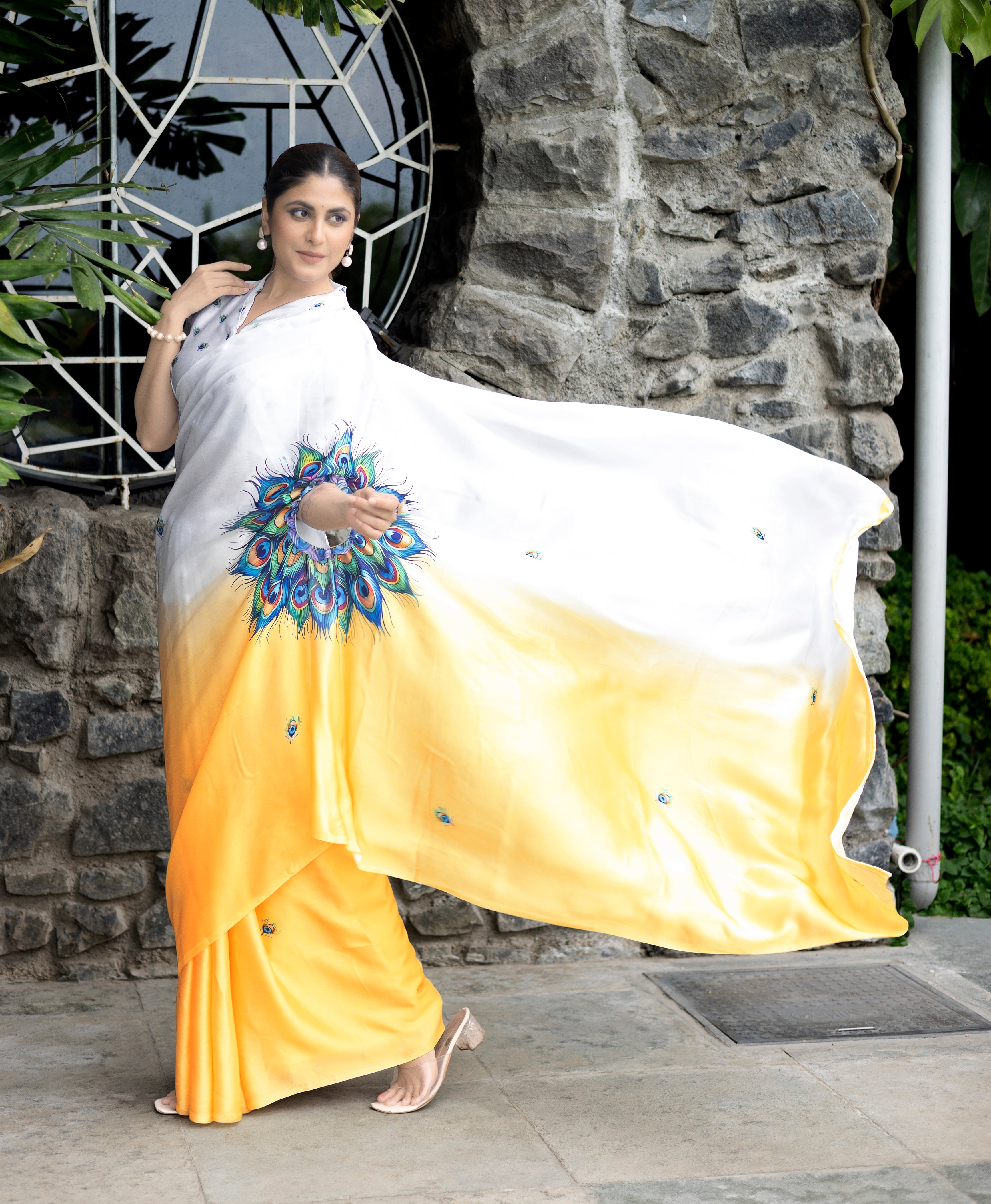 Saree description - Soft & smooth satin Georgette with beautiful peacock feather digital print comes with a stay able free-hand design with Yellow & White colour combination