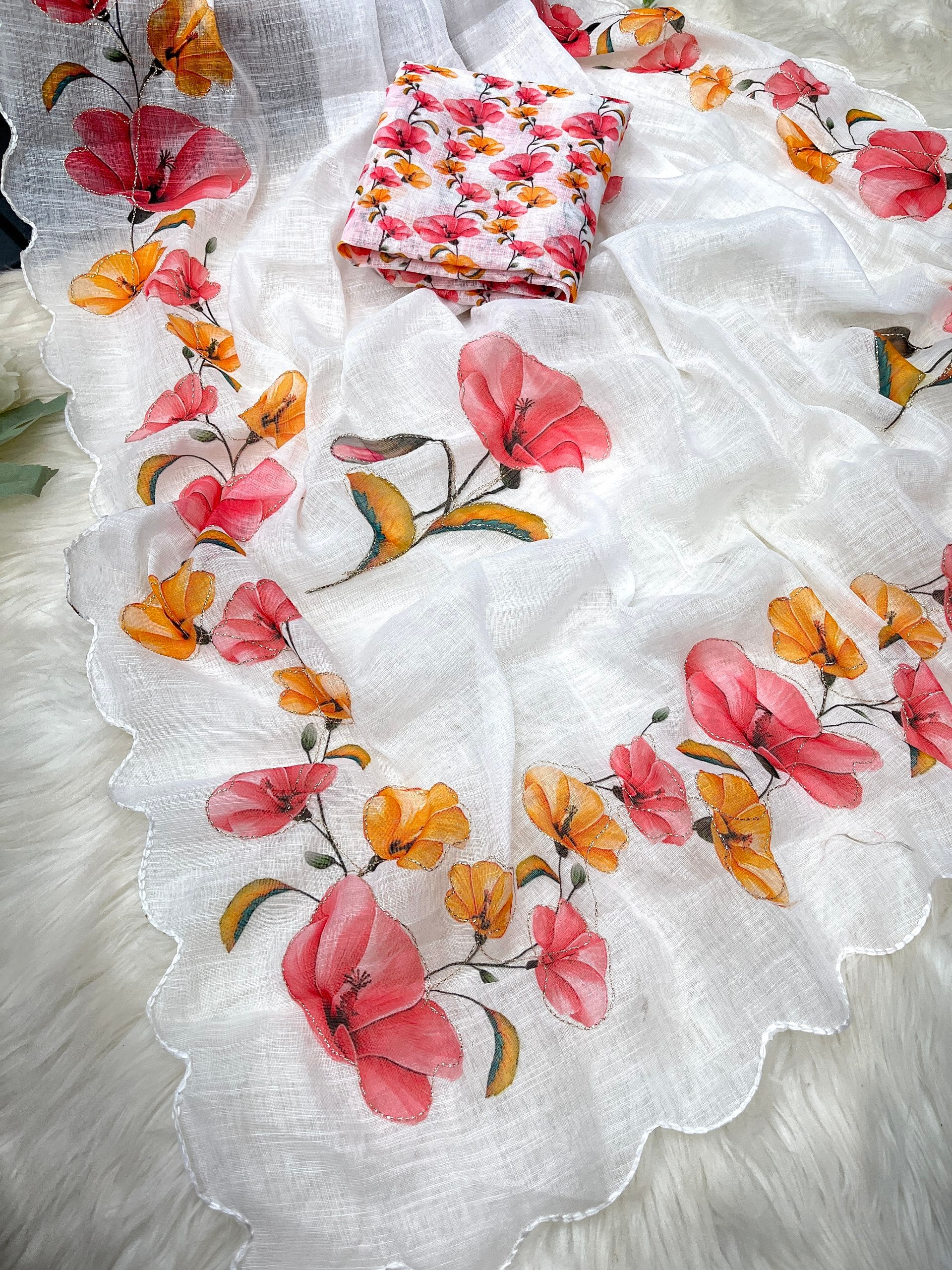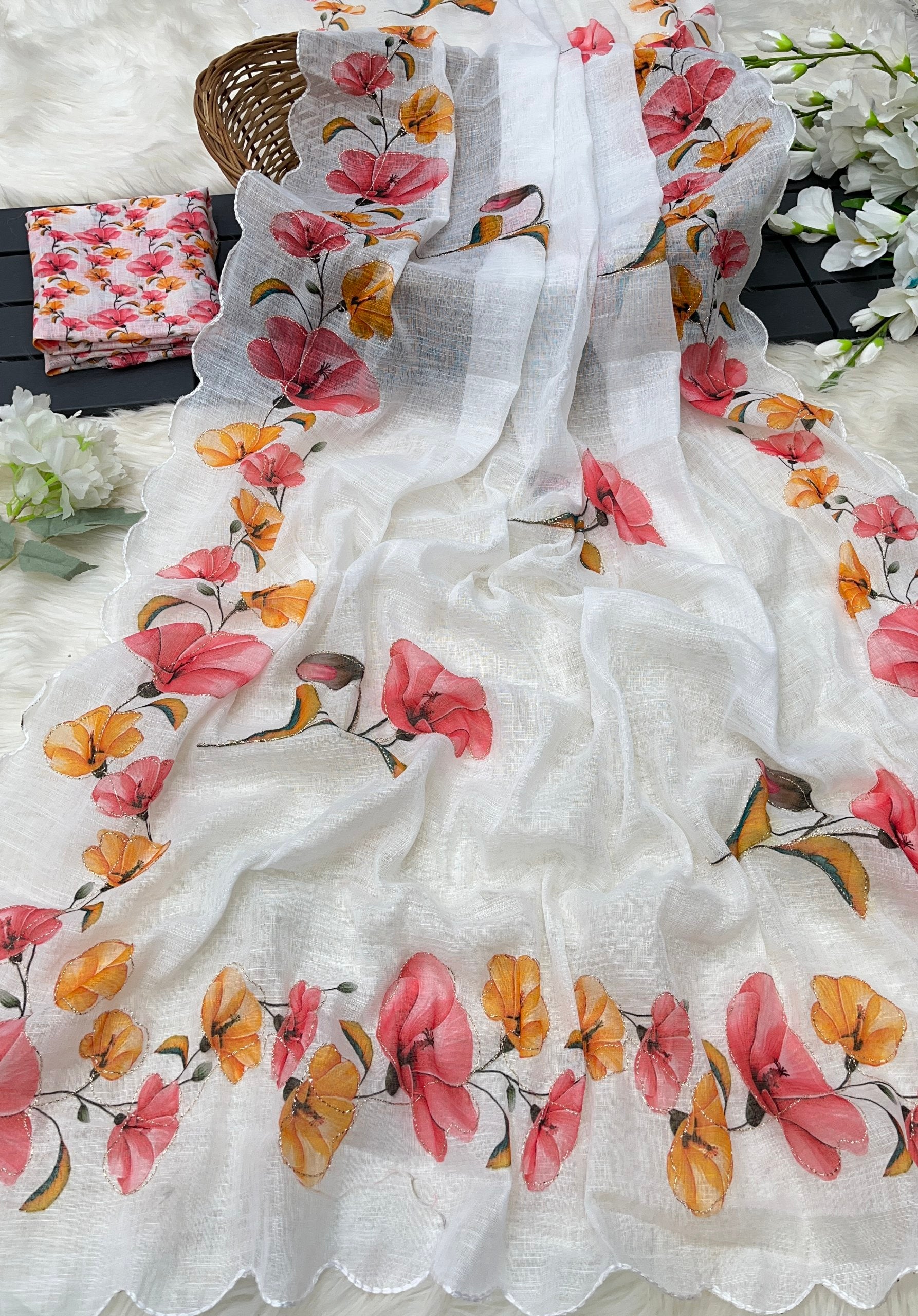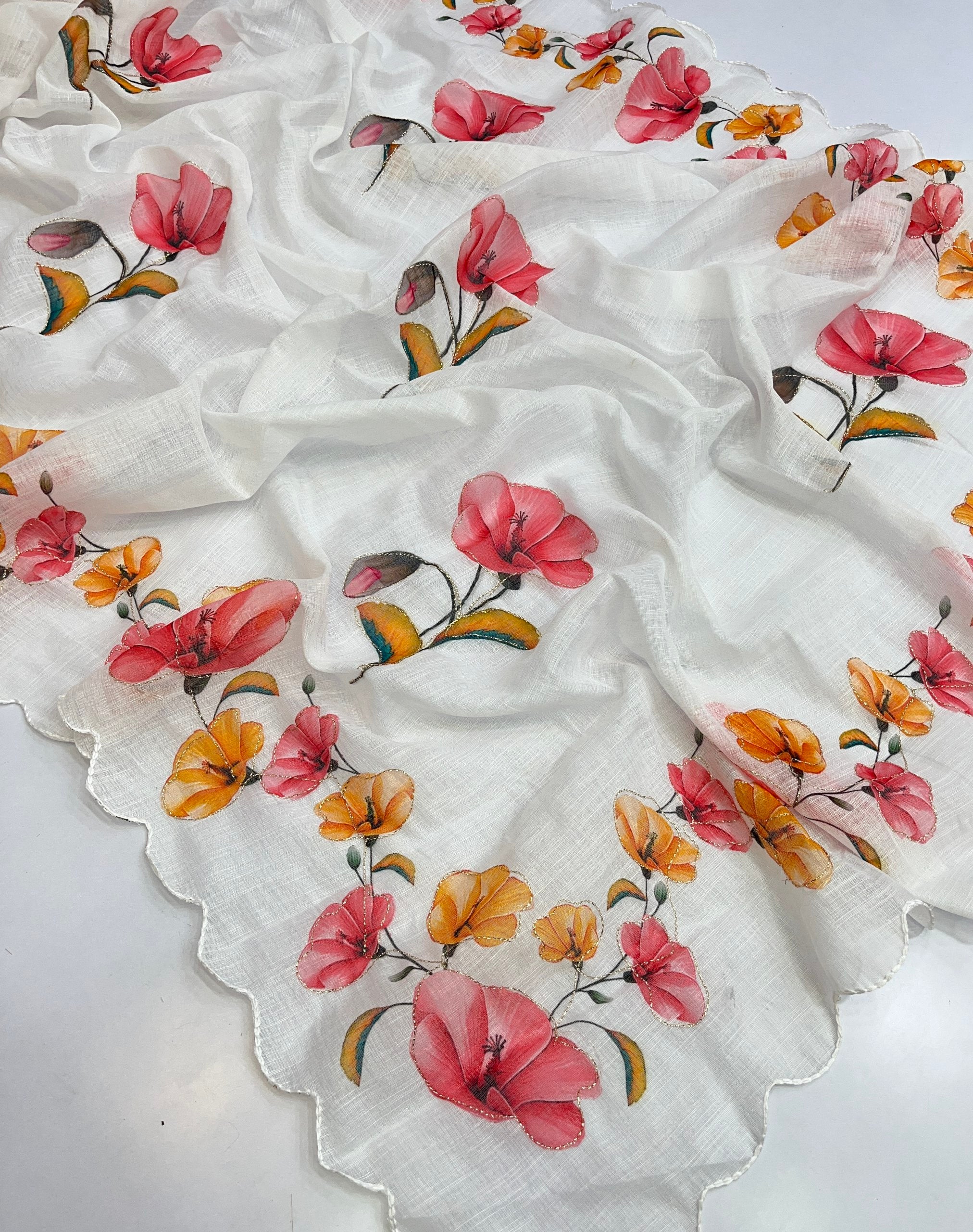 Saree description - Soft linen floral digital printed saree with embroidery work zari outing with scalloped cutwork border