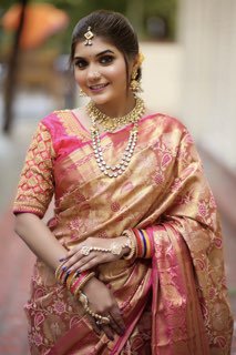 Saree description -Kanjivaram semi pattu silk gold zari weaving pink colour with floral weaving design, comes with 10 inch mango design pink colour weaving border & rich weaving pallu.