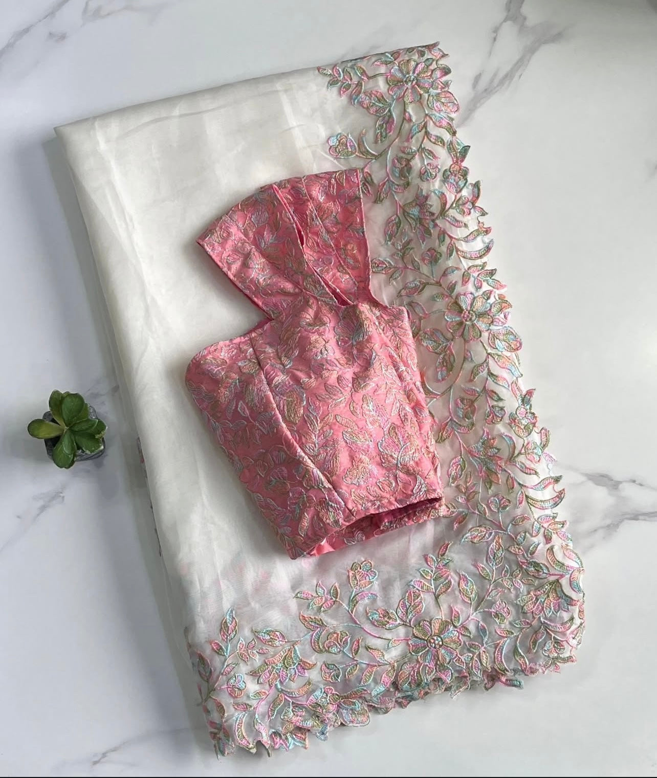 Saree details - Soft & smooth Organza Silk offwhite colour comes with multi colour embroidery thread work comes with scalloped cutwork border & pallu.