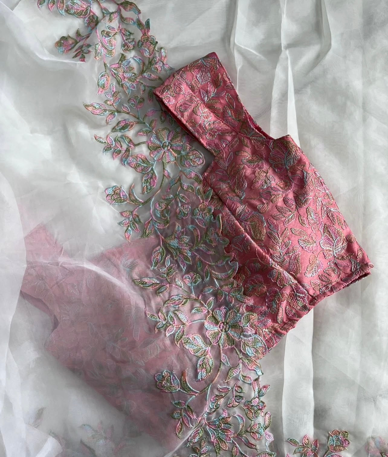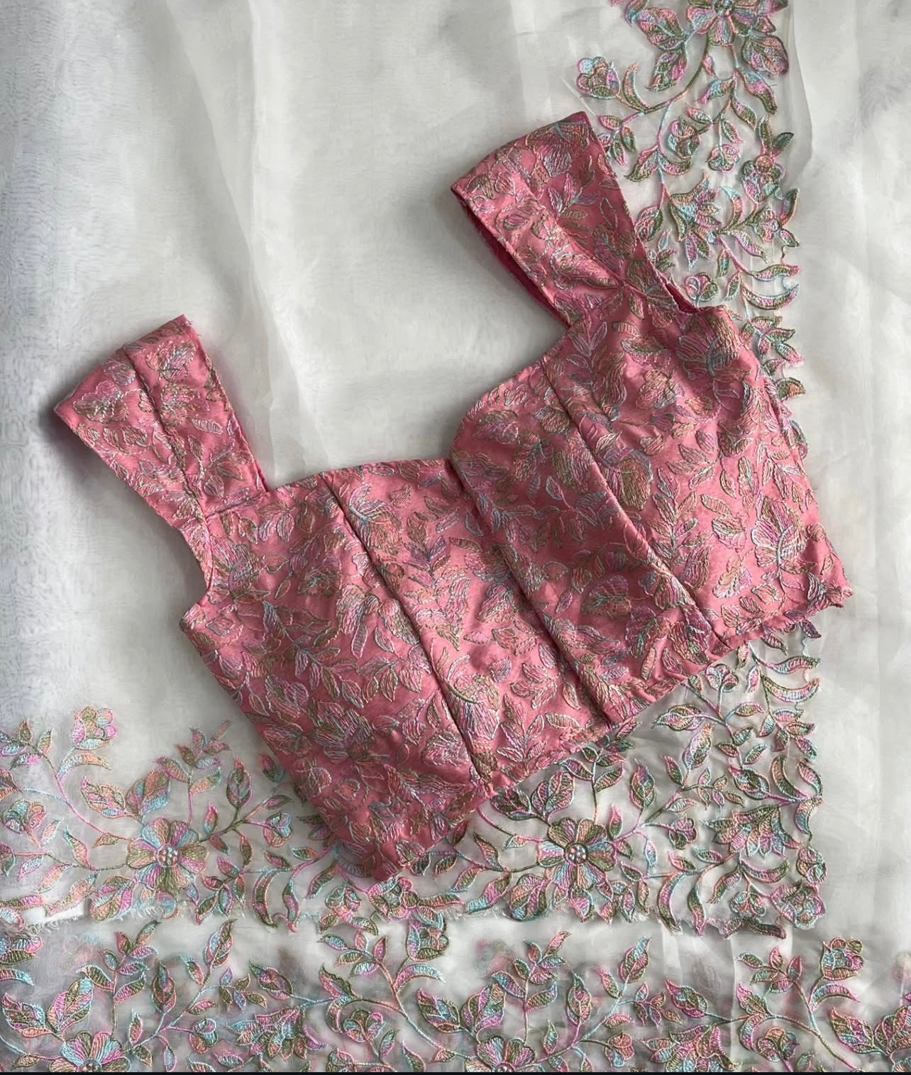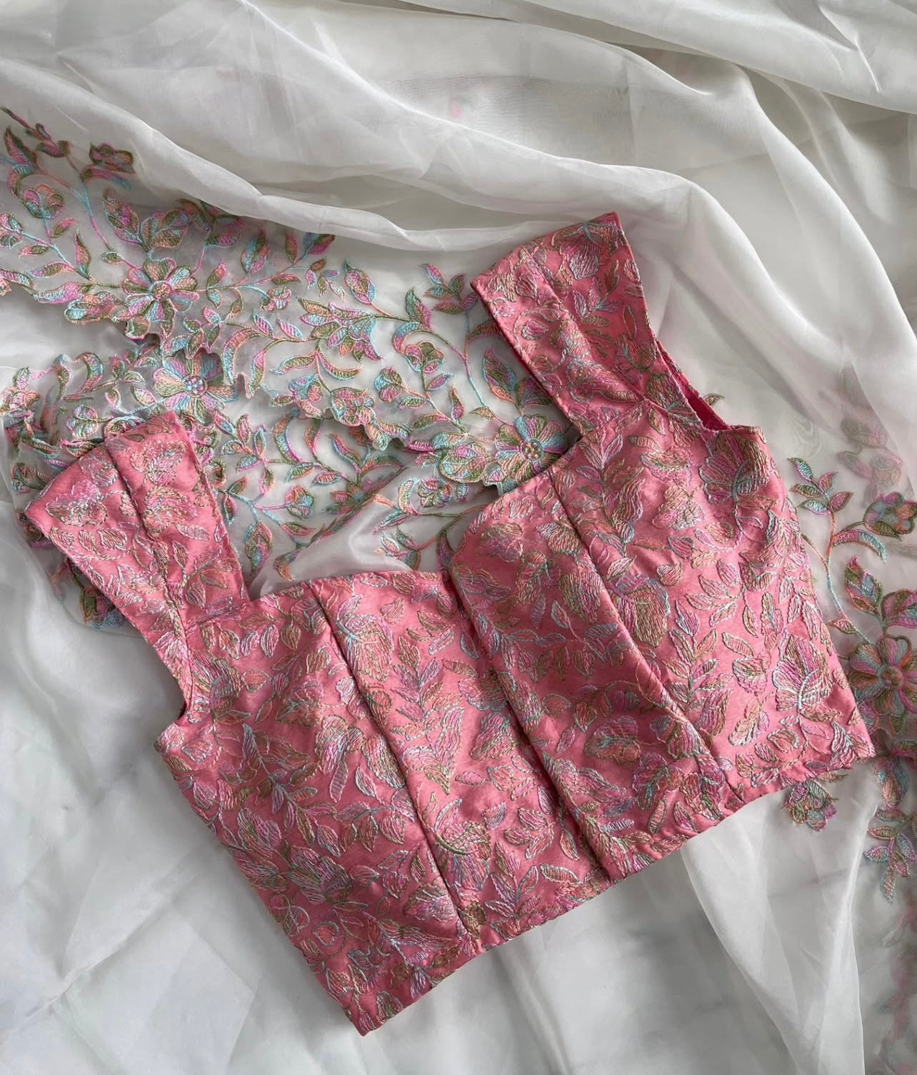 Blouse details - contrast peach colour embroidery work blouse (unstitched blouse)