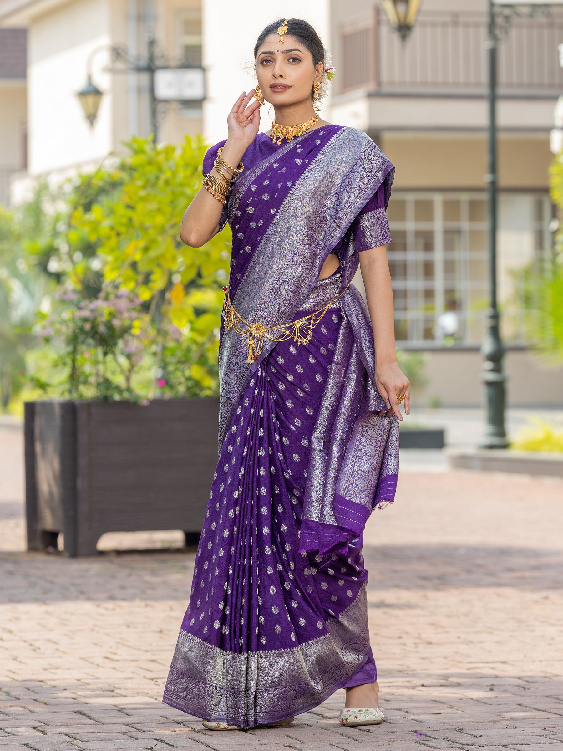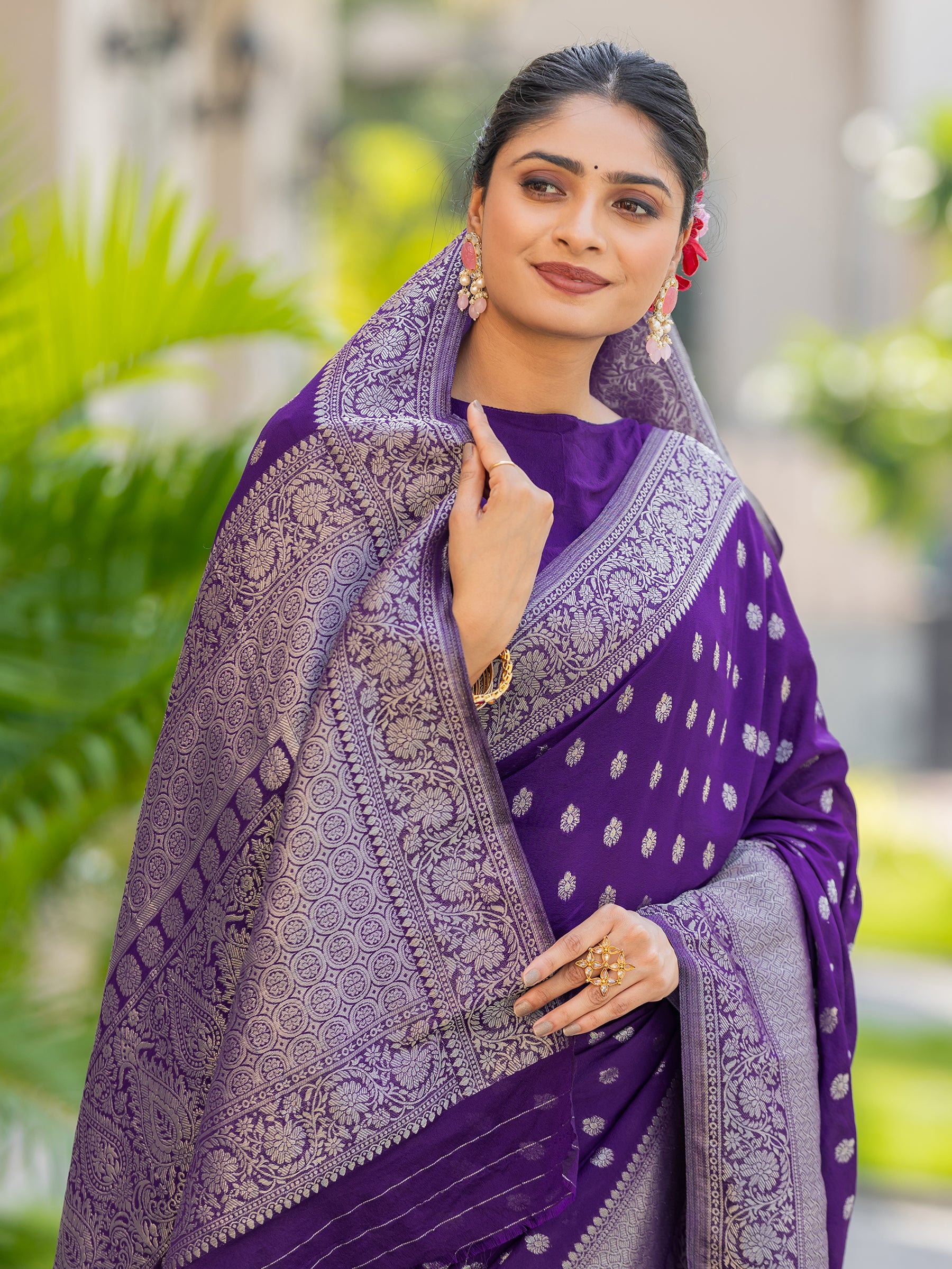 Saree description - Khadi georgette hand dyed purple colour saree comes with silver zari weaving 1000 butti & floral design 8inch weaving border comes with floral & leaf design rich weaving pallu.