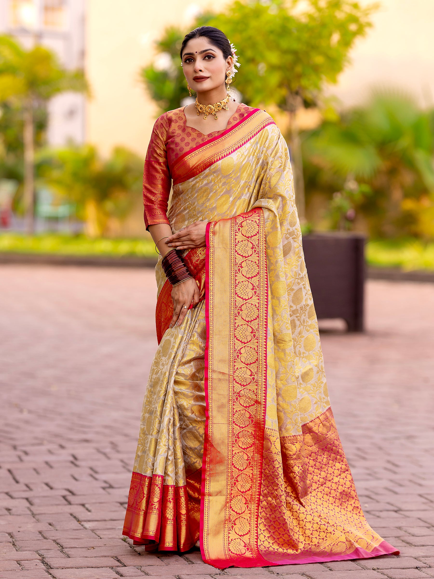 Saree description - Kanjivaram tissue silk white colour saree with gold zari floral design weave comes with pink colour floral weaving contrast border & contrast rich weaving pallu.