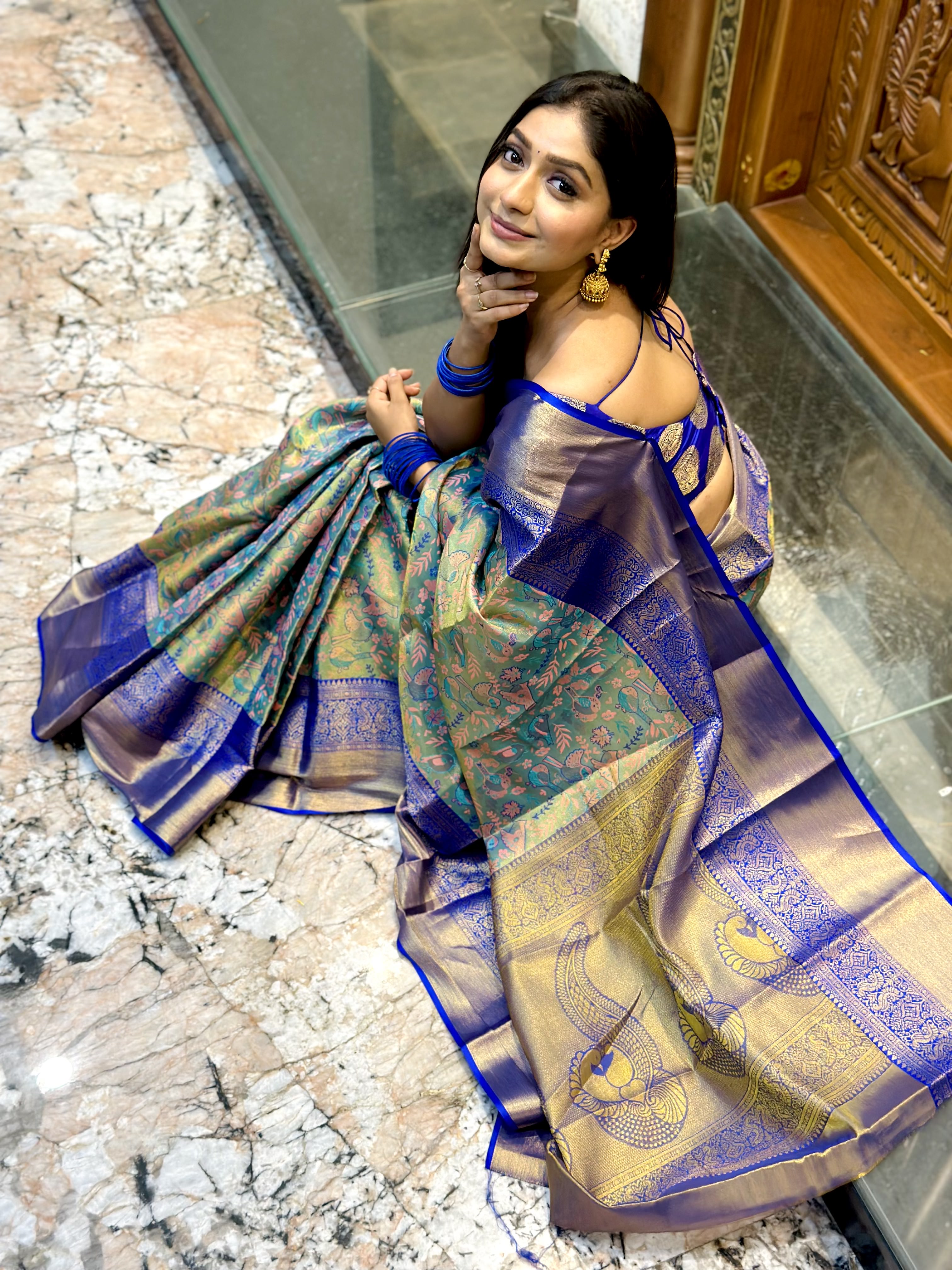 Saree description - Kanjivaram semi pattu silk gold zari weaving Seagreen colour with sparrow & floral mina weaving design, comes with 8inch peacock design purple colour weaving border & peacock weaving design rich weaving pallu.