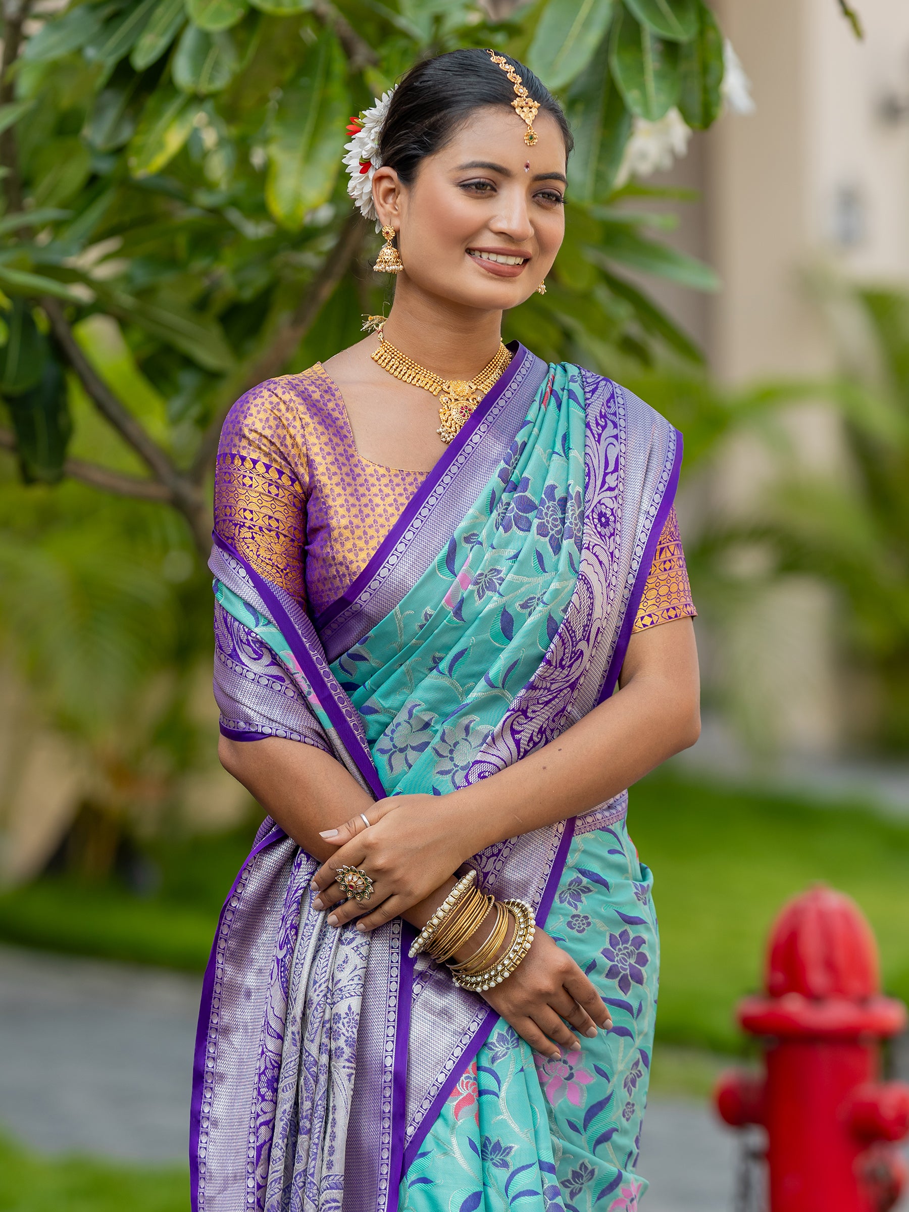 Saree description - Kanjivaram semi pattu silk silver zari weaving skyblue colour with floral design & mina weave, comes with 8 inch mango design purple colour weaving border & rich weaving pallu.
